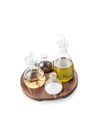 MENAGE SET 4 PEZZI VETRO C/VASSOIO ACACIA