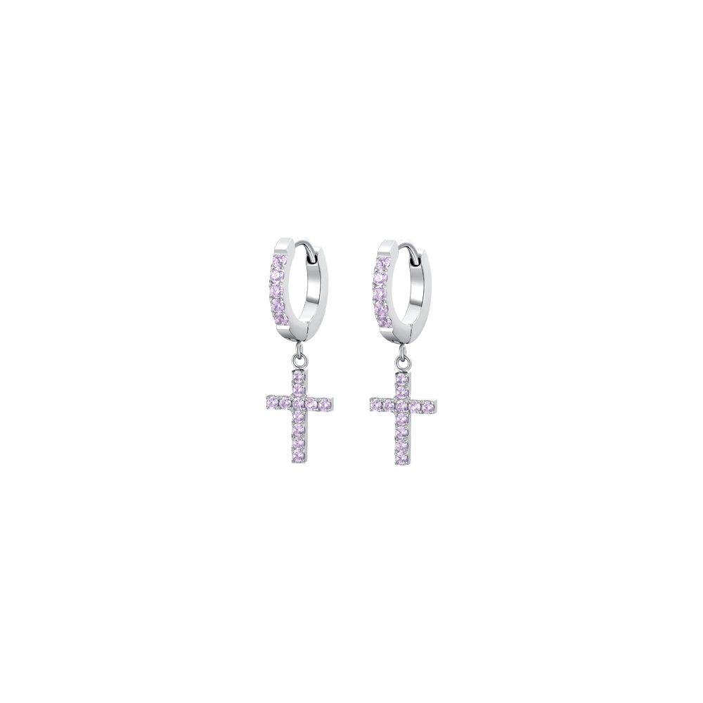 ORECCHINI DONNA CERCHIO IN ACCIAIO CON CROCE E ZIRCONI ROSA